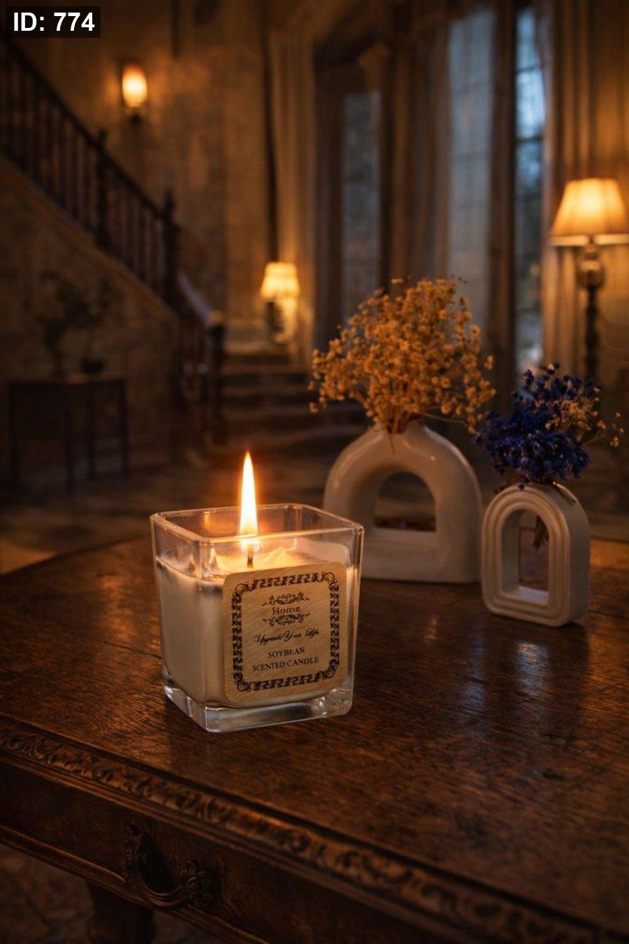 شمع زجاج مربع مع ورد مجفف